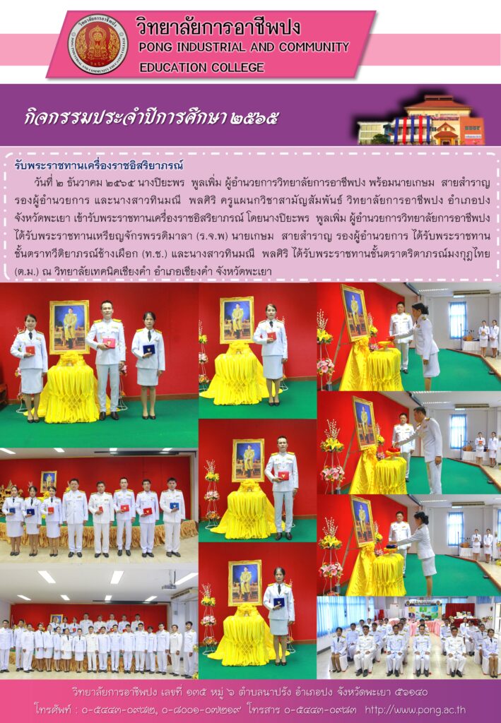 วันที่ ๒ ธันวาคม ๒๕๖๕ นางปิยะพร พูลเพิ่ม ผู้อำนวยการวิทยาลัยการอาชีพปง พร้อมนายเกษม สายสำราญ รองผู้อำนวยการ และนางสาวทินมณี พลศิริ ครูแผนกวิชาสามัญสัมพันธ์ วิทยาลัยการอาชีพปง อำเภอปง จังหวัดพะเยา เข้ารับพระราชทานเครื่องราชอิสริยาภรณ์ โดยนางปิยะพร พูลเพิ่ม ผู้อำนวยการวิทยาลัยการอาชีพปง ได้รับพระราชทานเหรียญจักรพรรดิมาลา (ร.จ.พ) นายเกษม สายสำราญ รองผู้อำนวยการ ได้รับพระราชทานชั้นตราทวีติยาภรณ์ช้างเผือก (ท.ช.) และนางสาวทินมณี พลศิริ ได้รับพระราชทานชั้นตราตริตาภรณ์มงกุฎไทย (ต.ม.) ณ วิทยาลัยเทคนิคเชียงคำ อำเภอเชียงคำ จังหวัดพะเยา