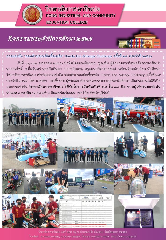 วันที่ ๑๑ – ๑๒ มกราคม ๒๕๖๖ นำทีมโดยนางปิยะพร พูลเพิ่ม ผู้อำนวยการวิทยาลัยการอาชีพปง นายร่มโพธิ์ หมื่นจันทร์ นายศักดิ์นภา กวาวสิบสาม ครูแผนกวิชาช่างยนต์ พร้อมด้วยนักเรียน นักศึกษา วิทยาลัยการอาชีพปง เข้าร่วมการแข่งขัน “ฮอนด้าประหยัดเชื้อเพลิง” Honda Eco Mileage Challenge ครั้งที่ ๒๕ ประจำปี ๒๕๖๖ โดย นายสง่า แต่เชื้อสาย ผู้ช่วยเลขาธิการคณะกรรมการการอาชีวศึกษา เป็นประธานในพิธีเปิดผลการแข่งขัน วิทยาลัยการอาชีพปง ได้รับโล่รางวัลอันดับที่ ๒๕ ใน ๓๐ ทีม จากผู้เข้าร่วมแข่งขัน จำนวน ๑๔๕ ทีม ณ สนามช้าง อินเตอร์เนชั่นแนล เซอร์กิต จังหวัดบุรีรัมย์