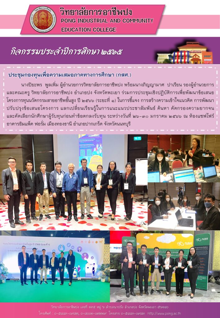 นางปิยะพร พูลเพิ่ม ผู้อำนวยการวิทยาลัยการอาชีพปง พร้อมนางภิญญามาศ ปาเรียน รองผู้อำนวยการ และคณะครู วิทยาลัยการอาชีพปง อำเภอปง จังหวัดพะเยา ร่วมการประชุมเชิงปฏิบัติการเพื่อพัฒนาข้อเสนอโครงการทุนนวัตกรรมสายอาชีพชั้นสูง ปี ๒๕๖๖ (ระยะที่ ๑) ในการชี้แจง การสร้างความเข้าใจแนวคิด การพัฒนา ปรับปรุงข้อเสนอโครงการ แลกเปลี่ยนเรียนรู้ในการแนะแนวประชาสัมพันธ์ ค้นหา คัดกรองความยากจน และคัดเลือกนักศึกษาผู้รับทุนก่อนทำข้อตกลงรับทุน ระหว่างวันที่ ๒๖-๓๐ มกราคม ๒๕๖๖ ณ ห้องแซฟไฟร์ อาคารอิมแพ็ค ฟอรั่ม เมืองทองธานี อำเภอปากเกร็ด จังหวัดนนทบุรี