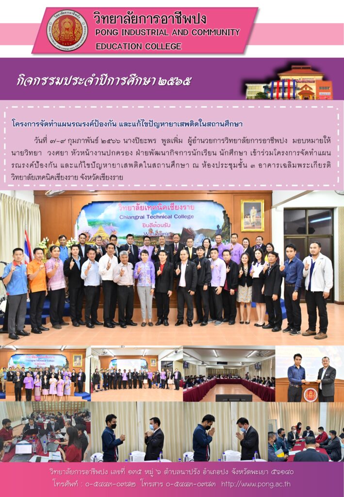 วันที่ ๗-๙ กุมภาพันธ์ ๒๕๖๖ นางปิยะพร พูลเพิ่ม ผู้อำนวยการวิทยาลัยการอาชีพปง มอบหมายให้ นายวิทยา วงศยา หัวหน้างานปกครอง ฝ่ายพัฒนากิจการนักเรียน นักศึกษา เข้าร่วมโครงการจัดทำแผนรณรงค์ป้องกัน และแก้ไขปัญหายาเสพติดในสถานศึกษา ณ ห้องประชุมชั้น ๓ อาคารเฉลิมพระเกียรติ วิทยาลัยเทคนิคเชียงราย จังหวัดเชียงราย