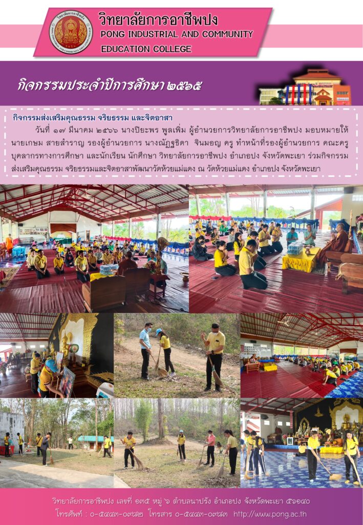 วันที่ ๑๗ มีนาคม ๒๕๖๖ นางปิยะพร พูลเพิ่ม ผู้อำนวยการวิทยาลัยการอาชีพปง มอบหมายให้ นายเกษม สายสำราญ รองผู้อำนวยการ นางณัฏฐธิดา จินมอญ ครู ทำหน้าที่รองผู้อำนวยการ คณะครู บุคลากรทางการศึกษา และนักเรียน นักศึกษา วิทยาลัยการอาชีพปง อำเภอปง จังหวัดพะเยา ร่วมกิจกรรมส่งเสริมคุณธรรม จริยธรรมและจิตอาสาพัฒนาวัดห้วยแม่แดง ณ วัดห้วยแม่แดง อำเภอปง จังหวัดพะเยา