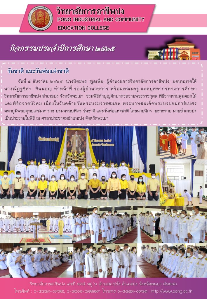 วันที่ ๕ ธันวาคม ๒๕๖๕ นางปิยะพร พูลเพิ่ม ผู้อำนวยการวิทยาลัยการอาชีพปง มอบหมายให้นางณัฏฐธิดา จินมอญ ทำหน้าที่ รองผู้อำนวยการ พร้อมคณะครู และบุคลากรทางการศึกษา วิทยาลัยการอาชีพปง อำเภอปง จังหวัดพะเยา ร่วมพิธีทำบุญตักบาตรถวายพระราชกุศล พิธีวางพานพุ่มดอกไม้และพิธีถวายบังคม เนื่องในวันคล้ายวันพระบรมราชสมภพ พระบาทสมเด็จพระบรมชนกาธิเบศร มหาภูมิพลอดุลยเดชมหาราช บรมนาถบพิตร วันชาติ และวันพ่อแห่งชาติ โดยนายนิกร ยะกะจาย นายอำเภอปง เป็นประธานในพิธี ณ ศาลาประชาคมอำเภอปง จังหวัดพะเยา