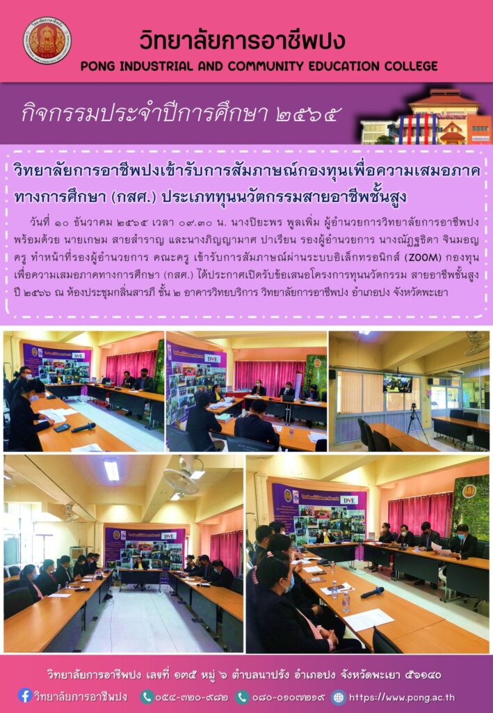 วันที่ ๑๐ ธันวาคม ๒๕๖๕ เวลา ๐๙.๓๐ น. นางปิยะพร พูลเพิ่ม ผู้อำนวยการวิทยาลัยการอาชีพปง พร้อมด้วย นายเกษม สายสำราญ และนางภิญญามาศ ปาเรียน รองผู้อำนวยการ นางณัฏฐธิดา จินมอญ ครู ทำหน้าที่รองผู้อำนวยการ คณะครู เข้ารับการสัมภาษณ์ผ่านระบบอิเล็กทรอนิกส์ (ZOOM) กองทุน เพื่อความเสมอภาคทางการศึกษา (กสศ.) ได้ประกาศเปิดรับข้อเสนอโครงการทุนนวัตกรรม สายอาชีพชั้นสูงปี ๒๕๖๖ ณ ห้องประชุมกลิ่นสารภี ชั้น ๒ อาคารวิทยบริการ วิทยาลัยการอาชีพปง อำเภอปง จังหวัดพะเยา