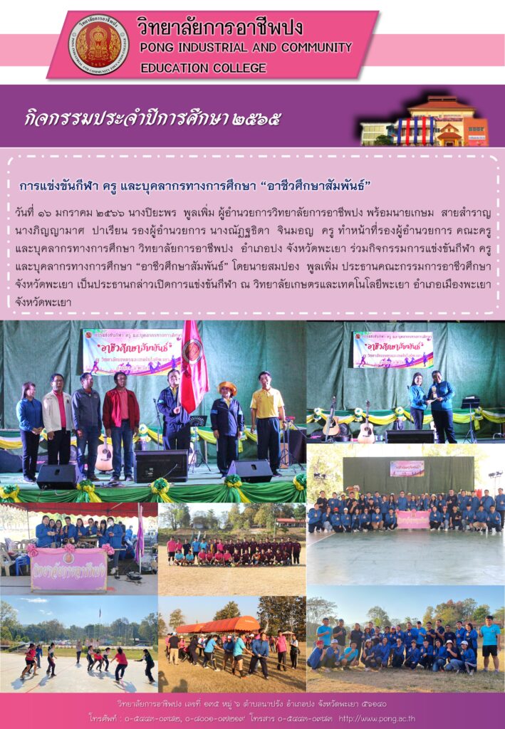 วันที่ ๑๖ มกราคม ๒๕๖๖ นางปิยะพร พูลเพิ่ม ผู้อำนวยการวิทยาลัยการอาชีพปง พร้อมนายเกษม สายสำราญนางภิญญามาศ ปาเรียน รองผู้อำนวยการ นางณัฏฐธิดา จินมอญ ครู ทำหน้าที่รองผู้อำนวยการ คณะครู และบุคลากรทางการศึกษา วิทยาลัยการอาชีพปง อำเภอปง จังหวัดพะเยา ร่วมกิจกรรมการแข่งขันกีฬาครู และบุคลากรทางการศึกษา “อาชีวศึกษาสัมพันธ์” โดยนายสมปอง พูลเพิ่ม ประธานคณะกรรมการอาชีวศึกษาจังหวัดพะเยา เป็นประธานกล่าวเปิดการแข่งขันกีฬา ณ วิทยาลัยเกษตรและเทคโนโลยีพะเยา อำเภอเมืองพะเยา จังหวัดพะเยา