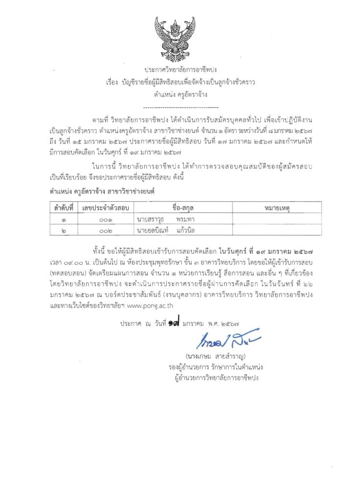 ข่าวประกาศงานบุคลากรบริหารทรัพยากร รายชื่อผู้มีสิทธิสอบ ตำเเหน่ง ครูอัตราจ้าง สาขาวิชาช่างยนต์ 17/01/2024 ประชาสัมพันธ์ วิทยาลัยการอาชีพปง จำนวนผู้เข้าชม : 157 FacebookFacebookXTwitterLINELine