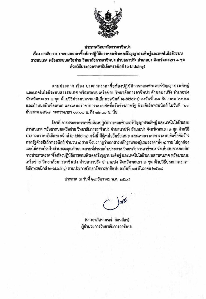 เรื่อง ยกเลิกการประกวดราคาซื้อห้องปฏิบัติการคอมพิวเตอร์ปัญญาประดิษฐ์และเทคโนโลยีระบบสารสนเทศพร้อมระบบเครือข่าย วิทยาลัยการอาชีพปง ตำบลนาปรัง อำเภอปง จังหวัดพะเยา 1 ชุด ด้วยวิธีประกวดราคาอิเล็กทรอนิกส์ (e-bidding)